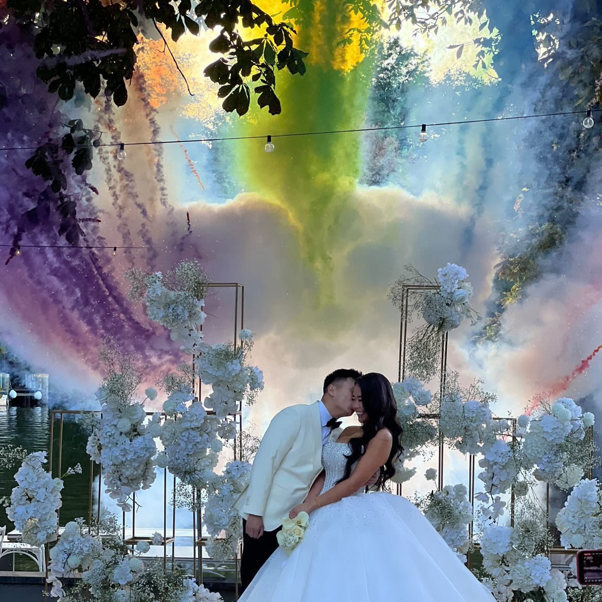 Leuchtende Rauchfontänen in Regenbogenfarben fächern sich auf und sorgen mit dem magischen Effekt für